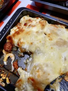 A család többi részének “kalóriaszegény” sűtt kolbit, véres-májas hurkát sütöttem, kis rizzsel, meg a finnyás kölkömnek rakott krumplit, a normál hozzávalókon kívül, kis diétás szalonnával, reszelt sajttal a tetején 💪